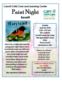 Carroll Child Care and Learning Center will be hosting a paint night fundraiser to benefit the Carroll Child Care and Learning Center. Join us for a bright and cheerful spring paint night where every brushstroke helps our child care center shine! Proceeds benefit the Carroll Child Care and Learning Center’s great work.  You’ll follow along with the instructor and learn some new painting techniques to create your Maryland Oriole Bird canvas.  (No experience required.)
